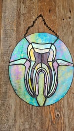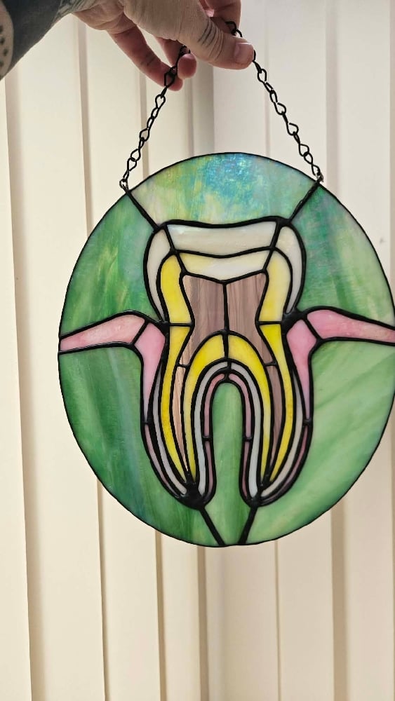 Fully iridescent anatomical tooth with options of other side that isn't fully iridescent, a truly correct anatomical tooth handmade with lead and stained glass.